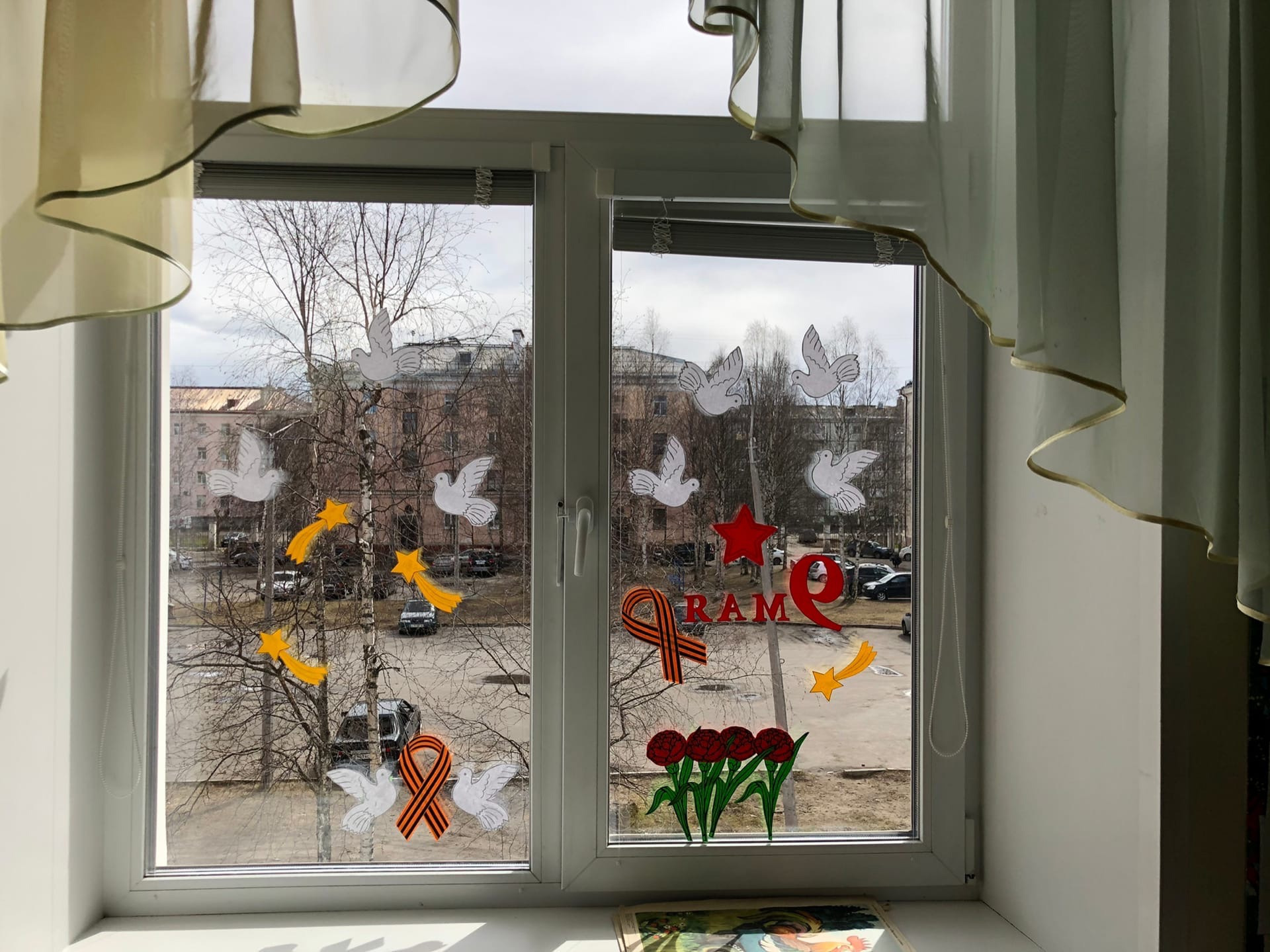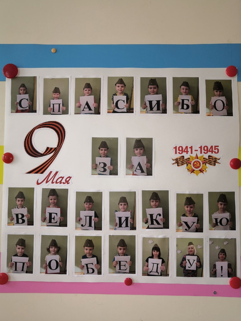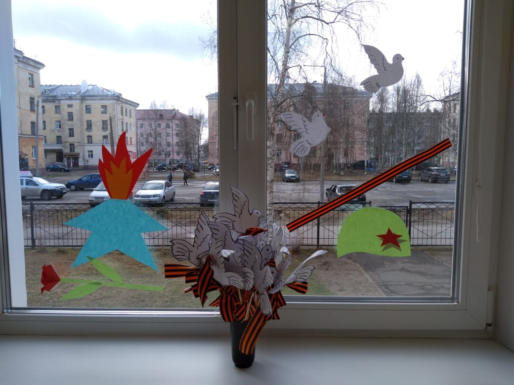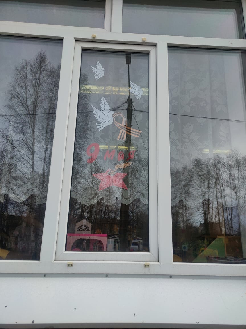 Окна групп украсили символами Великой Победы и словами благодарности в адрес ветеранов.
