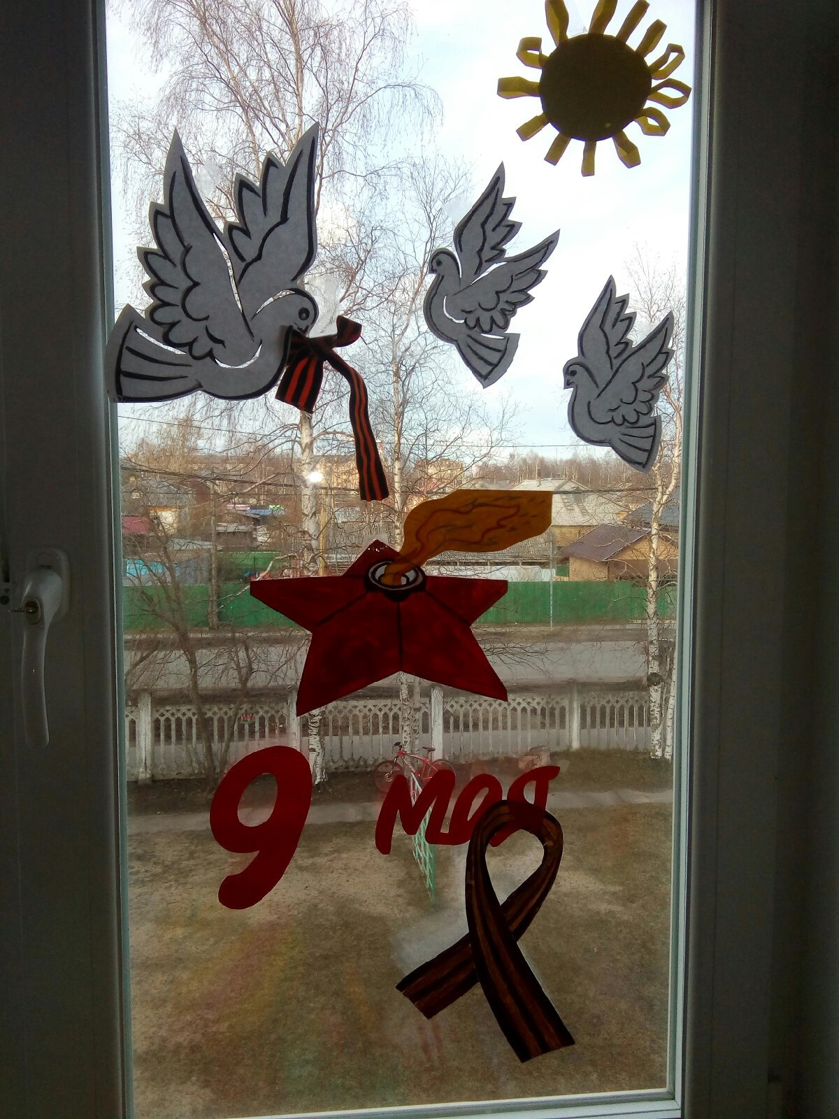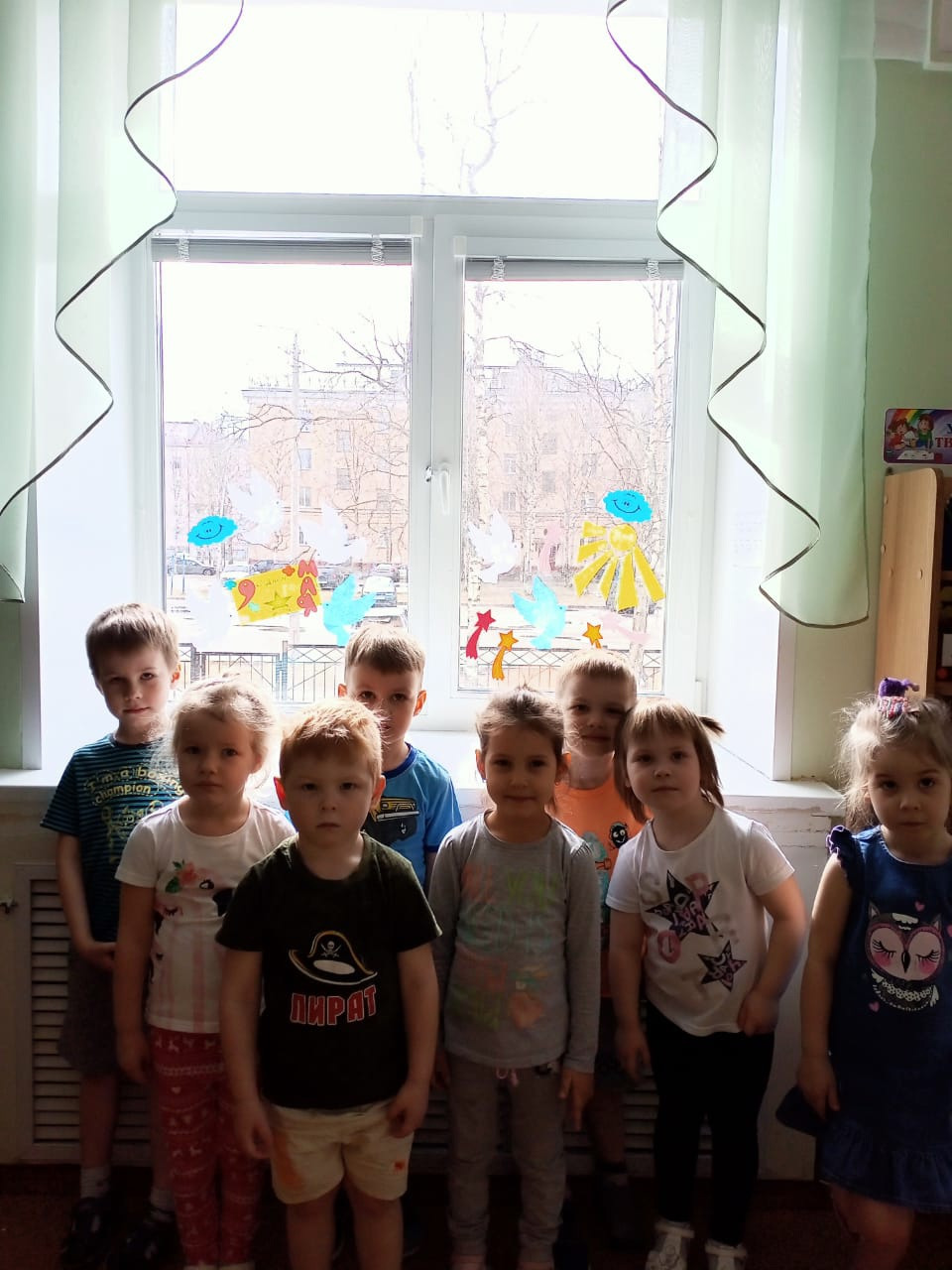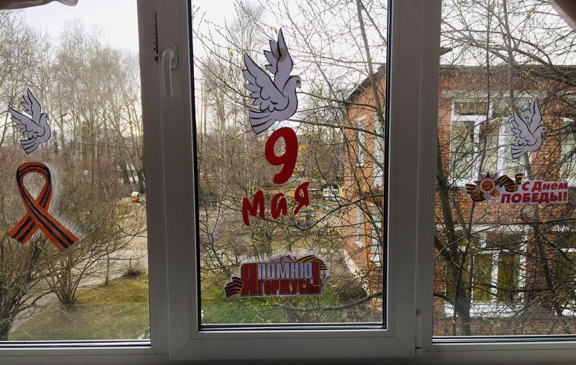 Окна групп украсили символами Великой Победы и словами благодарности в адрес ветеранов.