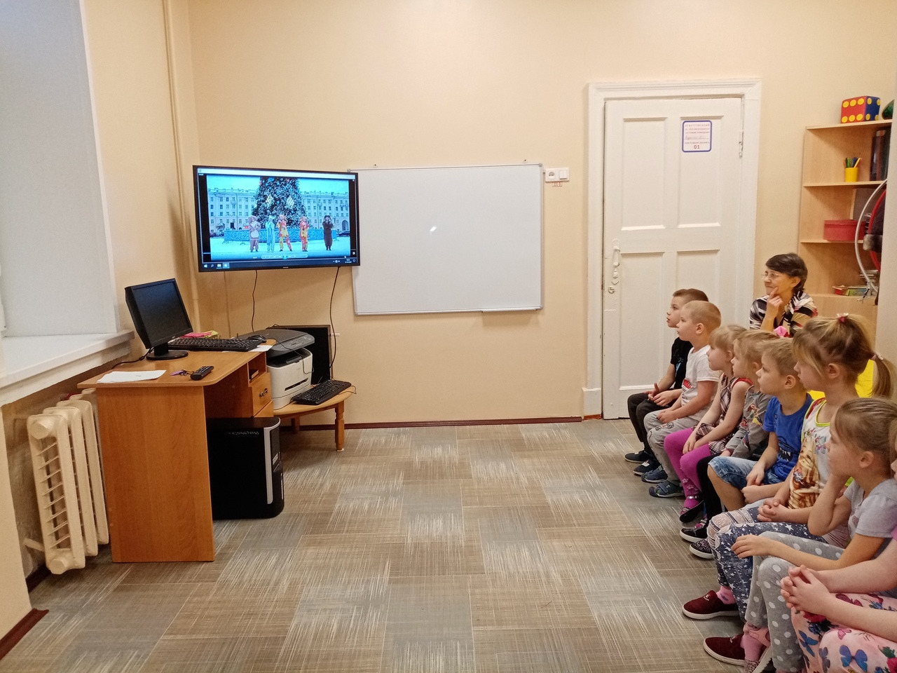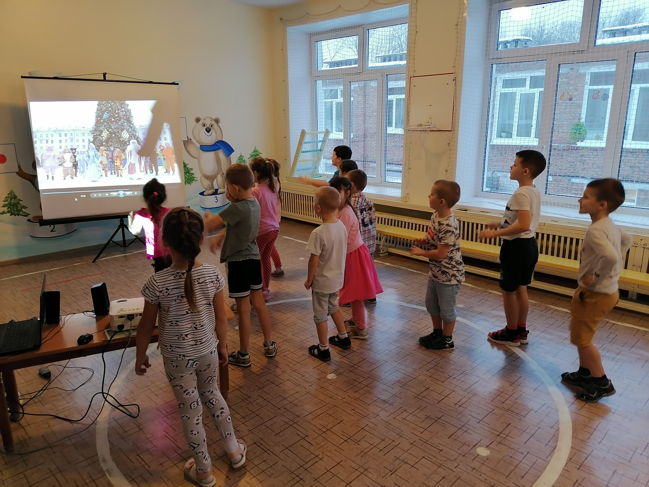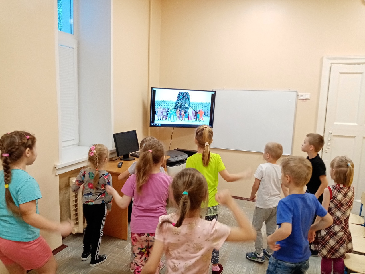 Во время просмотра видеоролика дети помогли Деду Морозу и Снегурочке зажечь огоньки на новогодней елке, смогли поучаствовать в зажигательном танцевальном флешмобе “Все танцуют “Чику-рику” и водили хоровод под звуки известной песни “В лесу родилась елочка”.