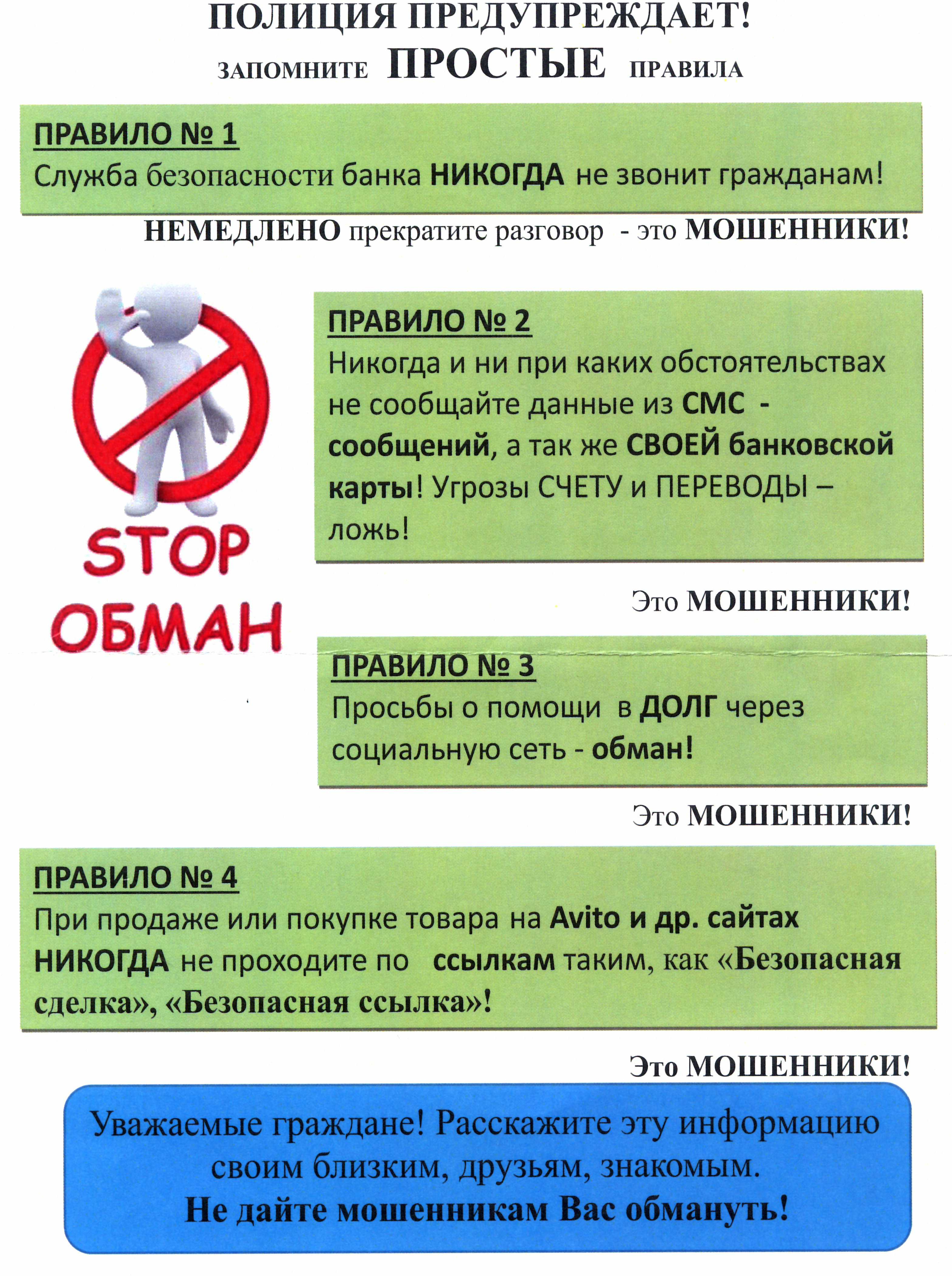 Полиция России обращается к Вам в связи с участившимися случаями попыток мошенничества. Специально разработанное полицией руководство поможет вам обезопасить себя и своих близких. Соблюдение этих простых правил – Ваш вклад в безопасность как вашего дома и имущества, так и ваших друзей и родных!