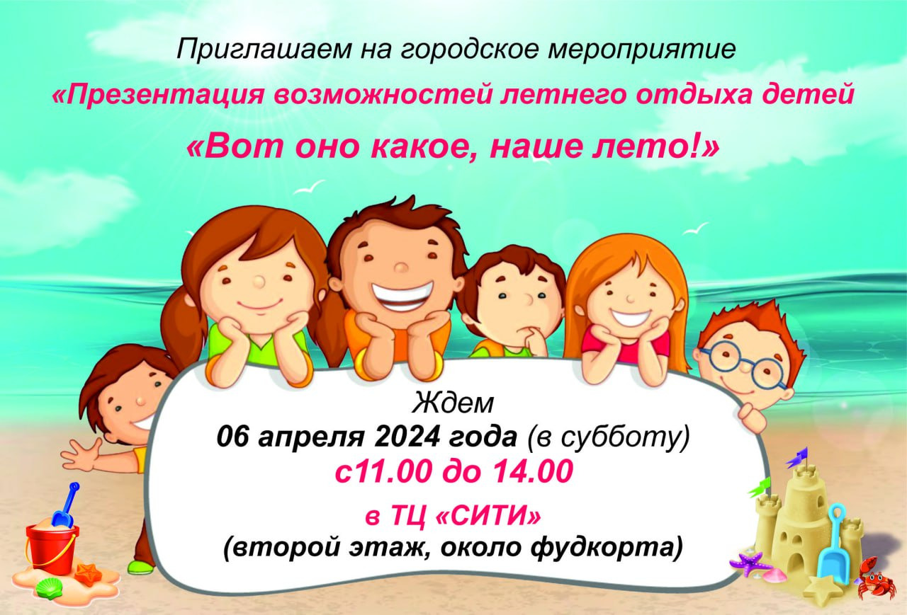 06 апреля 2024 года в ТЦ СИТИ (на втором этаже в районе фудкорта) с 11.00 до 14.00 проводится городское мероприятие «Презентация возможностей летнего отдыха детей «Вот оно какое, наше лето!».
